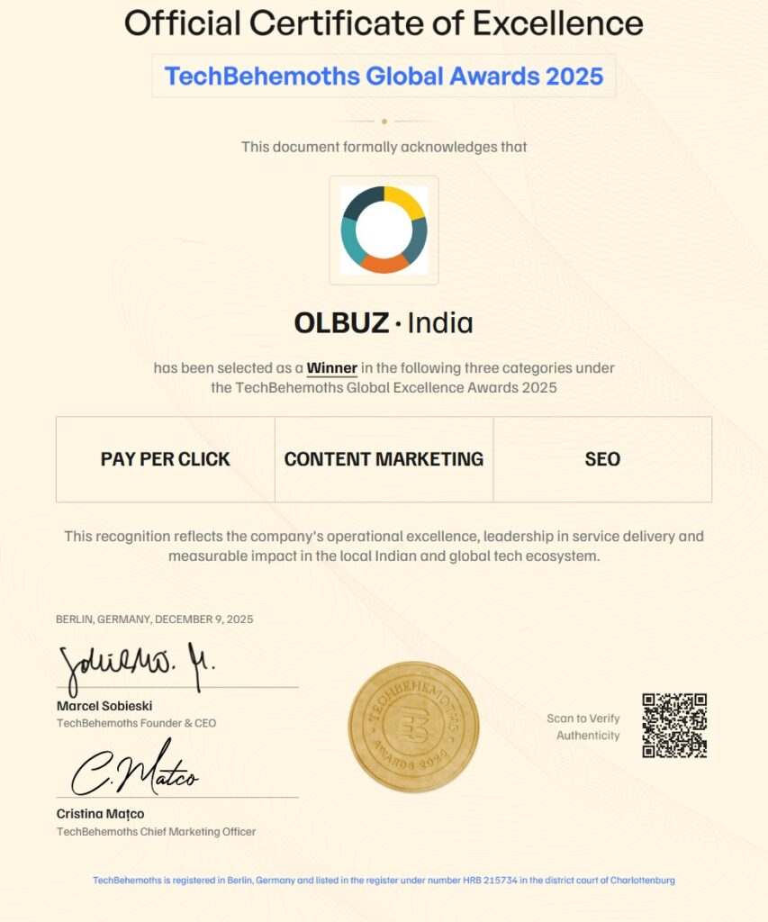 We are thrilled to announce that OLBUZ has been awarded the TechBehemoths 2025 Award, marking an extraordinary milestone—five consecutive years of recognition spanning from 2021 to 2025. This achievement places OLBUZ among the most elite digital marketing companies worldwide, showing our continued commitment to quality services and client success.